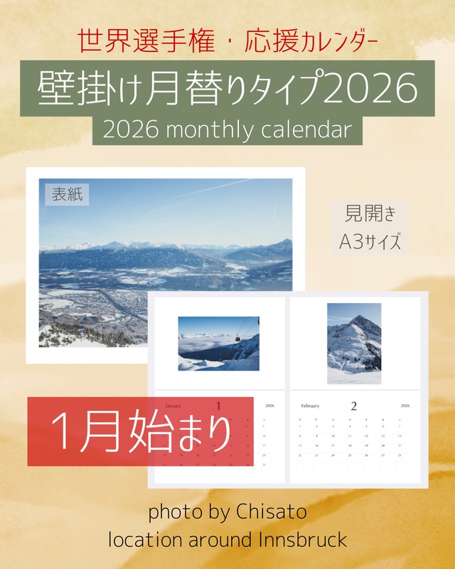 こちらは【1月始まり】商品です。 配送希望の方はこちらからご注文ください。 手渡し希望は直接DMでも注文いただけます!(DMの方が早くお渡しできます。) 仕様:見開きA3サイズ、書き込みスペースあり 【1月始まり】15冊限定!!年始にお届け。 【4月始まり】完全受注生産。予約期間〜2月末まで。3月中お届け予定。 * 日めくりと月替りカレンダーで、コンセプトを変えてみました。 日めくりカレンダーは、インスブルックのカジュアルな日常をメインに…夏の写真と冬の写真を交互に楽しんでいただけるような写真セレクト。 月替わりカレンダーは、冬…雪のある風景に限定して、凛とした雰囲気のセレクトに。 写真は、オーストリアのインスブルックでの、私の一年間のワーホリ生活で撮り溜めたスナップです。 * 昨シーズン転戦したFWTチャレンジャーの成績から、FWTシリーズ2025のアジアランキングでトップとなり、この冬初開催のFISフリーライド世界選手権2026への出場権を獲得しました。 カレンダーの収益は、この海外遠征資金に当てさせていただきます。 遠征中は、世界選手権の他にも3つのFWT Qualifier(3~4*)に出場予定です。 初めての大舞台。アンドラ、ピレネー山脈という未知の山で、自分の滑りを発揮し、良い成績が残せるように頑張ります。応援いただけましたら嬉しいです。 * 参考遠征予算(合計約110〜120万) ・渡航費:約20万 ・宿、レンタカー、ガソリン:約60万 ・リフト券:約15〜20万 ・大会エントリー費:約10万 ・その他 食費等:約5万〜