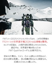 昨シーズン転戦したFWTチャレンジャーの成績から、FWTシリーズ2025のアジアランキングでトップとなり、この冬初開催のFISフリーライド世界選手権2026への出場権を獲得しました。